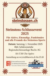 Wir laden euch herzlich zum Schlussevent des Steinstossen 2025 ein. Gemeinsam möchten wir auf ein spannendes und erfolgreiches Wettkampfjahr zurückblicken, die Höhepunkte feiern und in geselliger Runde den Saisonabschluss geniessen. Für Verpflegung, gute Stimmung und ein abwechslungsreiches Programm ist gesorgt.